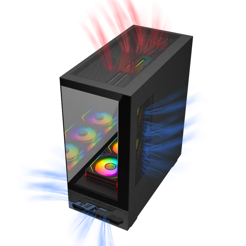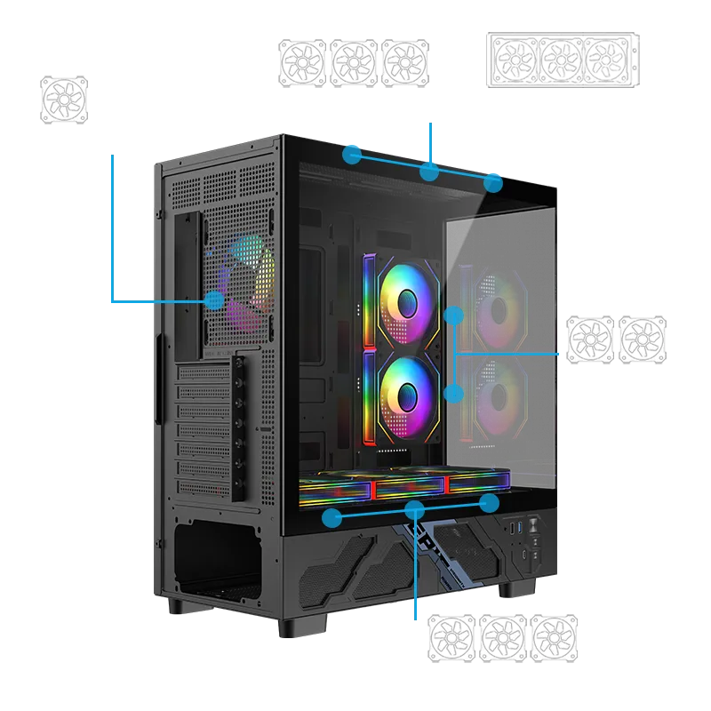 支援頂部三組120mm風扇、後部一組120mm風扇、電源艙三組120mm風扇安裝,以及主機板側邊兩組120mm風扇,提供卓越的散熱性能,確保系統穩定運行。此外,頂部還支援360mm水冷安裝,顯著提升散熱效果。高效散熱,穩定運行