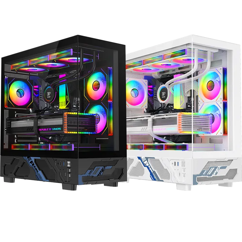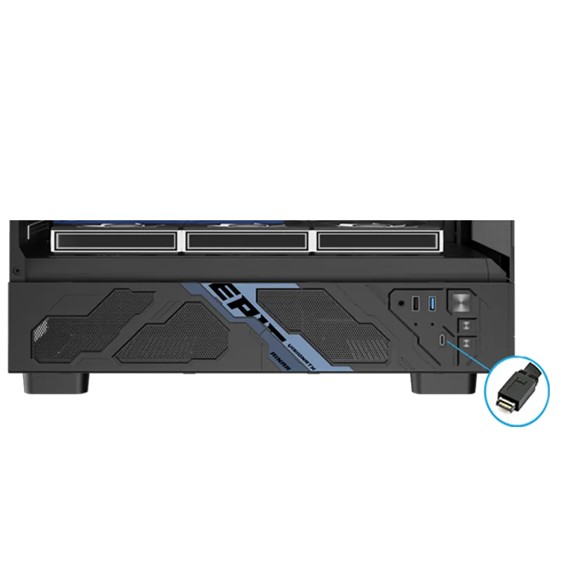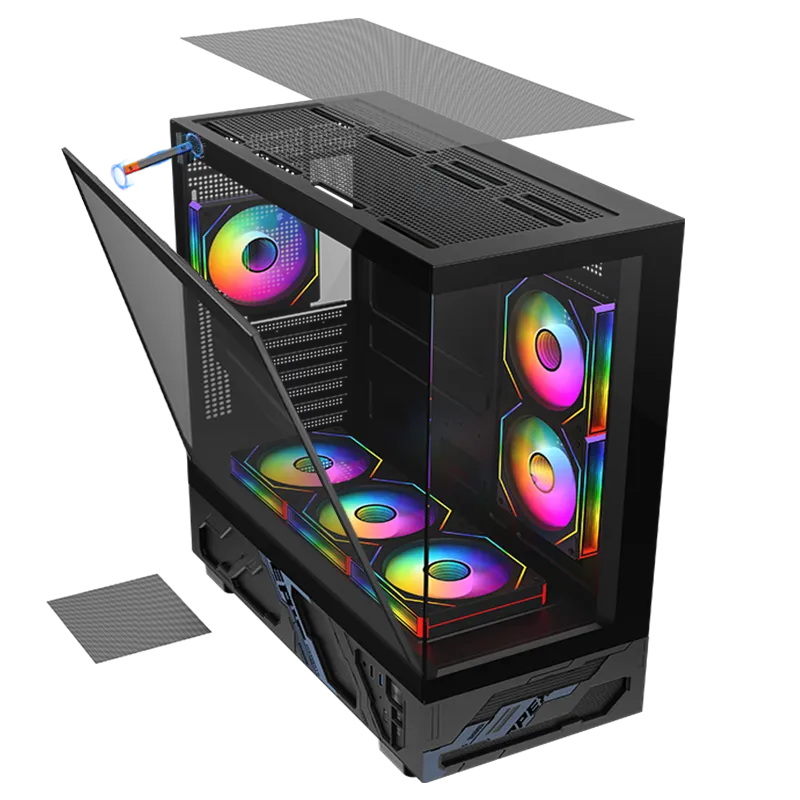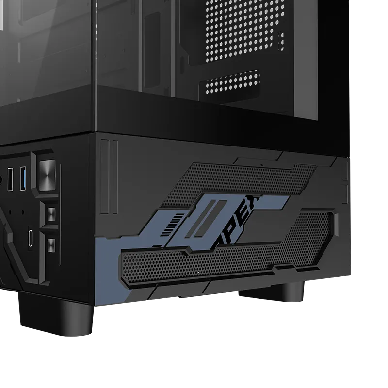Vision ATX L215 提供黑白兩色選擇,配備 TYPE-C 接口,標配六顆 K07 全鏡面風扇,其中兩顆安裝於主機板區域,一顆安裝於後部,並在底部配有三顆反向風扇,顯著提升系統的散熱效果。側邊I/O,電競飾板