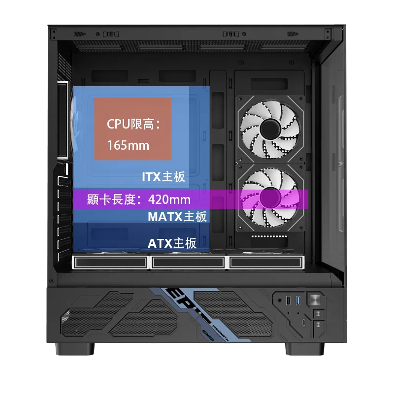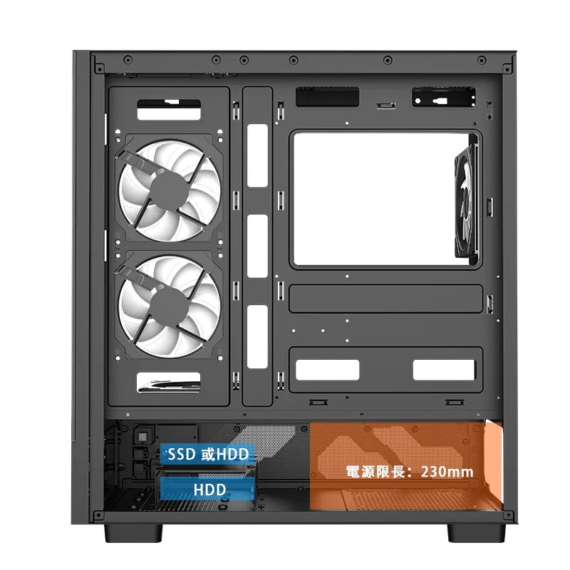 內部硬體支援包括主機板、散熱器、顯示卡和硬碟的使用規格標準,確保系統穩定運行與高效性能。頂部加高60mm空間設計,專為安裝 360 水冷系統打造,有效避免干涉,提供更寬裕的安裝空間硬體支援II